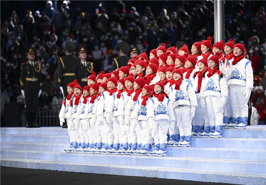 During the closing ceremony, the Malanhua Children's Choir from a mountainous area of Fuping county in Hebei province performed again, this time with different clothes.