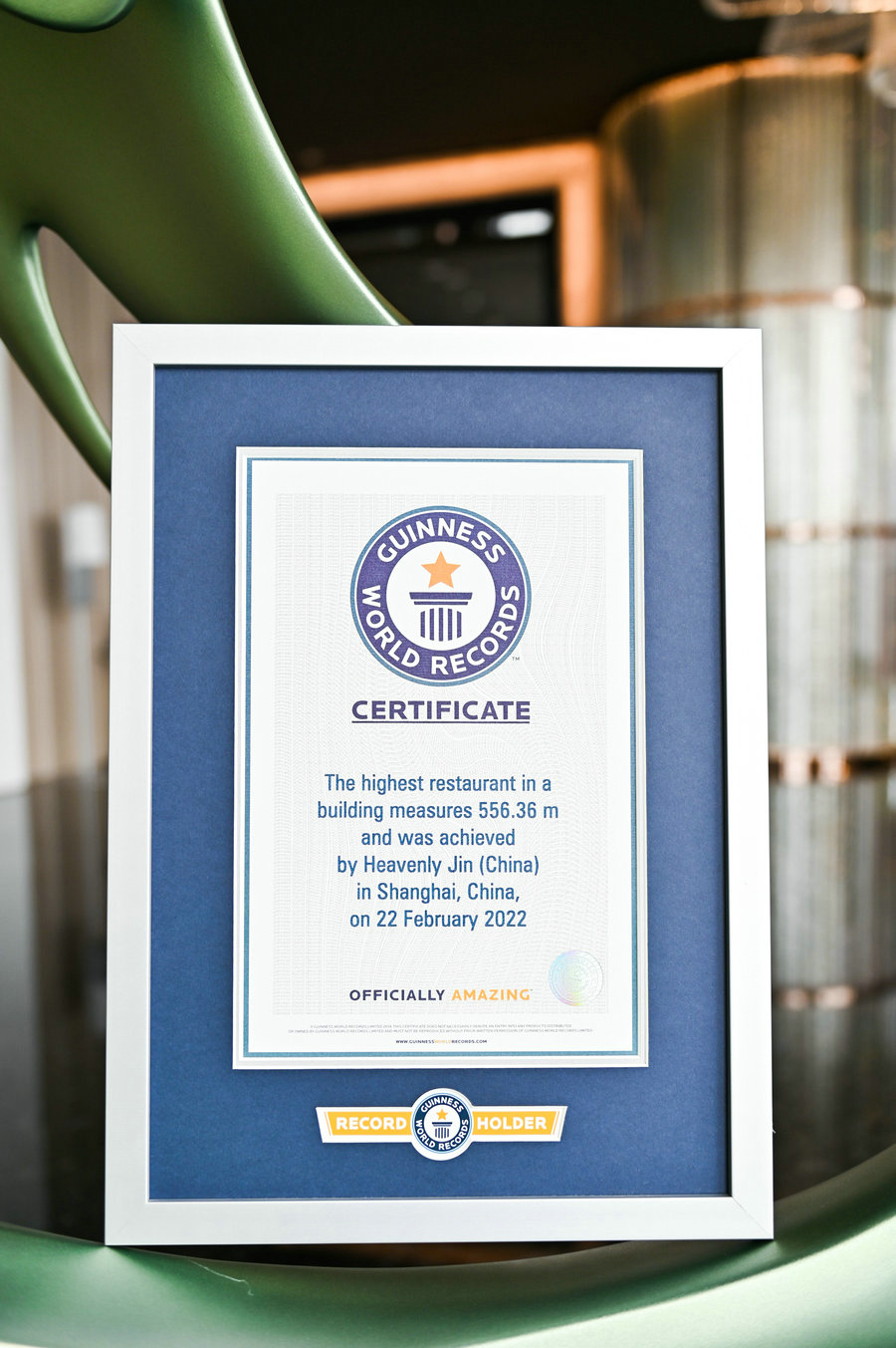 The Heavenly Jin restaurant, located 556.36 meters above ground, was certified by Guinness World Records as the “highest restaurant in a building” on Tuesday. [Photo provided to chinadaily.com.cn]