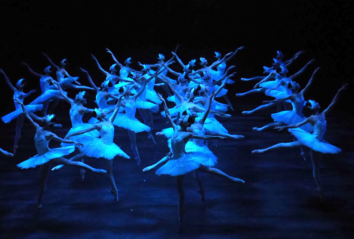 Actors of Shanghai Ballet perform Swan Lake at Shanghai International Dance Center, Feb 22, 2022. On the same day, Shanghai Ballet held a press conference to announce the launch of a new season, with 11 classic, modern, contemporary and revolution-themed ballet productions to be staged at seven theaters across Shanghai starting this month.[Photo/Xinhua]