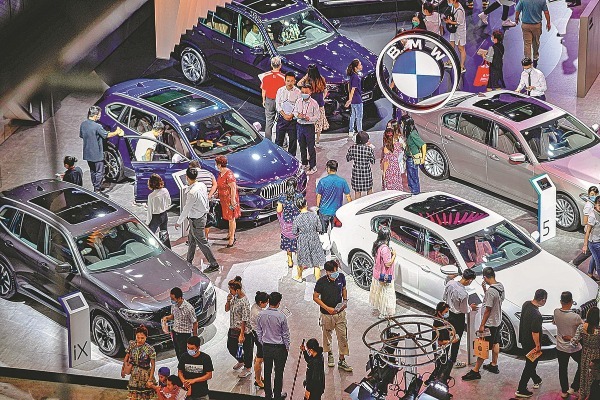 Visitors inspect a range of vehicles displayed at the BMW booth at an international auto show held in Haikou, Hainan province, in March last year. [Photo by Wang Chenglong/For China Daily]