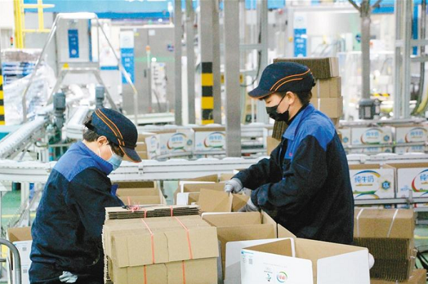 Two employees get busy at a factory in Xi'an operated by dairy giant, Yili Group. [Photo/Xi'an Daily]