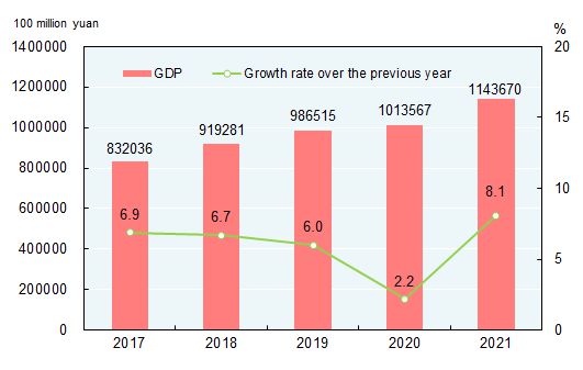 According to preliminary estimation, the gross domestic product (GDP) in 2021 was 114,367.0 billion yuan, up by 8.1 percent over the previous year with the average two-year growth of 5.1 percent.