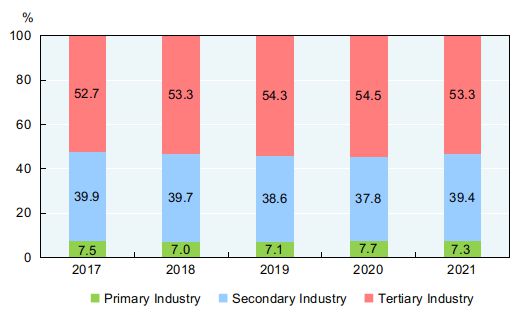 The value added of the primary industry accounted for 7.3 percent of the GDP; that of the secondary industry accounted for 39.4 percent; and that of the tertiary industry accounted for 53.3 percent. The contribution of the final consumption expenditure to GDP growth rate was up by 5.3 percentage points, that of the gross capital formation to GDP growth rate up by 1.1 percentage points and that of the net exports of goods and services to GDP growth rate up by 1.7 percentage points.