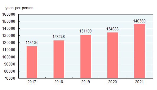 The per capita GDP in 2021 was 80,976 yuan, up by 8.0 percent over the previous year. The gross national income in 2021 was 113,351.8 billion yuan, up by 7.9 percent over the previous year. The overall labor productivity was 146,380 yuan per person in 2021, up by 8.7 percent over the previous year.