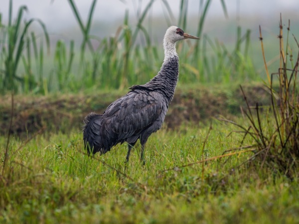A hooded crane stands amid the grass in the Beihu Marshland in Hangzhou, East China's Zhejiang province. [Photo provided to chinadaily.com.cn]