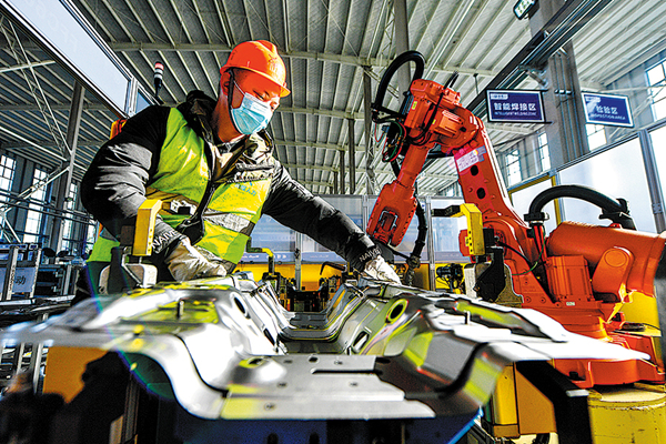An employee works at a smart auto parts production facility in Huzhou, Zhejiang province, in December. [Photo by TAN YUNFENG/FOR CHINA DAILY]