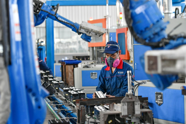 A staff member works on an automobile battery production line in Huzhou, Zhejiang province. [Photo by Tan Yunfeng/for China Daily]