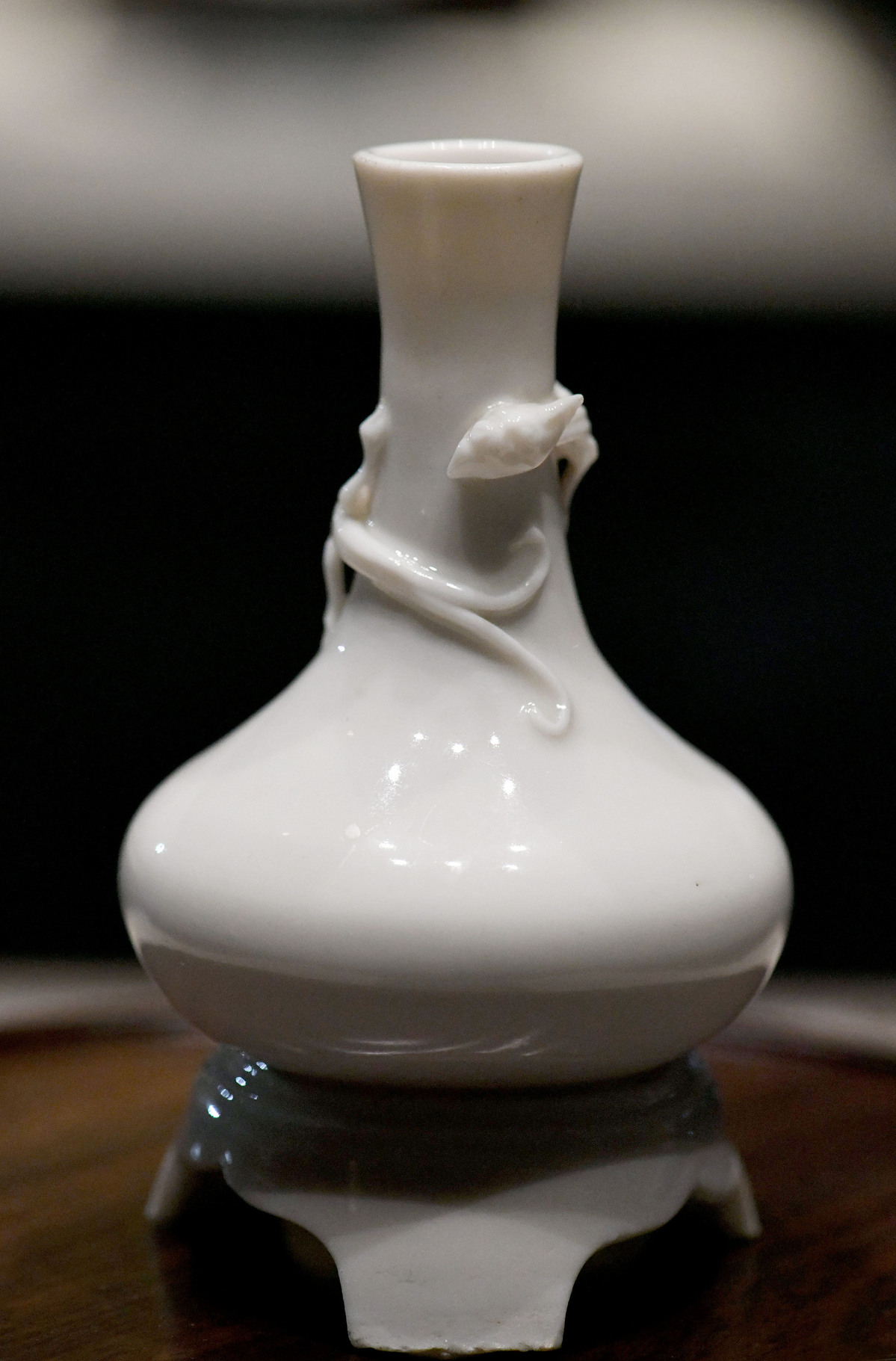 White-glazed vase with a pedestal, Dehua ware, is on view at the Zhenhai Tower exhibition area of the Guangzhou Museum. [Photo/VCG]