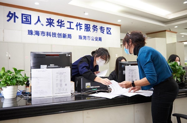 The special service area at the building's lobby was jointly set up by the Zhuhai Science & Technology Innovation and Public Security bureaus. Employers hiring overseas personnel can first submit applications for foreigner work permits on the online government affairs service platform of the Ministry of Science & Technology and wait for approval from the municipal Science & Technology Innovation Bureau. The working permits will then be handled by the Public Security Bureau at the special service area.
