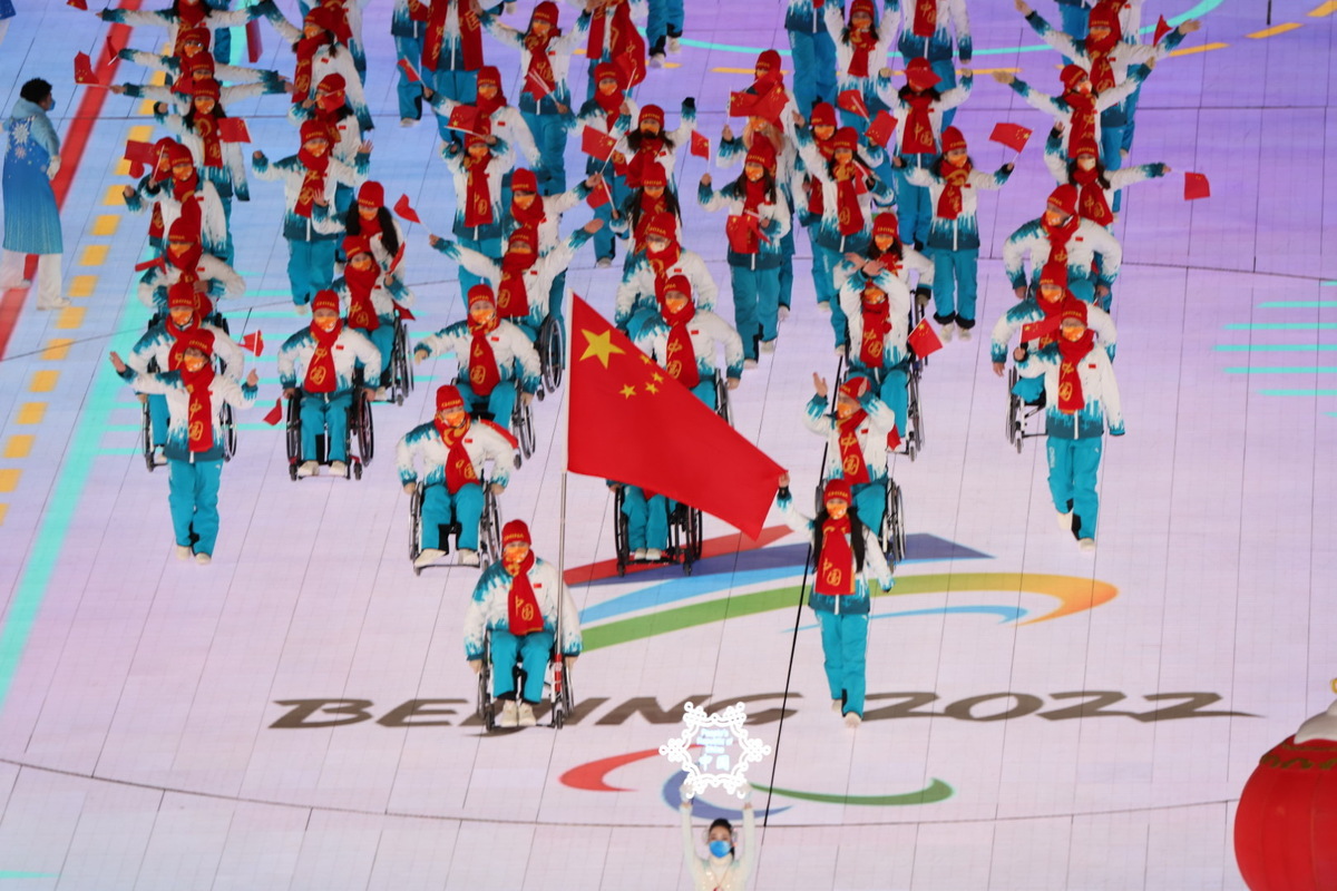 The delegation of the People's Republic of China parade into the National Stadium during the opening ceremony of the Beijing 2022 Paralympic Winter Games at the National Stadium in Beijing, March 4, 2022. [Photo by Feng Yongbin/chinadaily.com.cn]