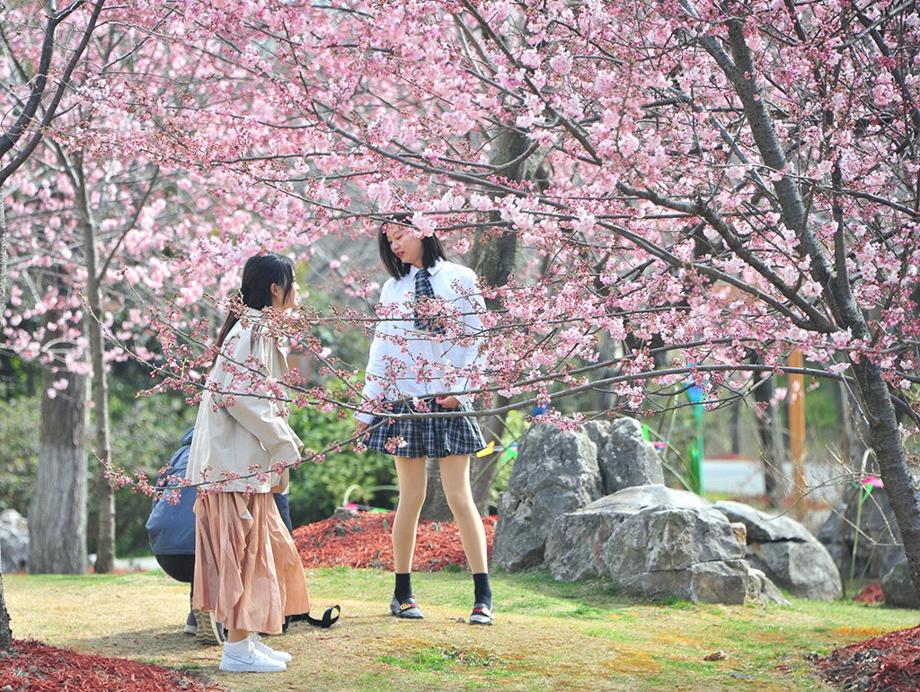 Pink cherry blossoms beckon residents to Gucun Park in Shanghai. [Photo/IC]