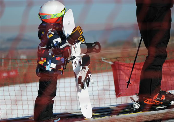A child takes part in a training program to learn how to snowboard at Yantai Nanli Ski Park on Feb 3. [Photo/Dazhong News]