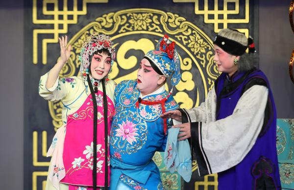Wang Xiaoli, Liu Mingzhe and Zhao Shikang, who are all Wang Rongrong's students, perform an exerpt of classic Peking Opera piece at the event. [Photo by Zou Hong/China Daily]