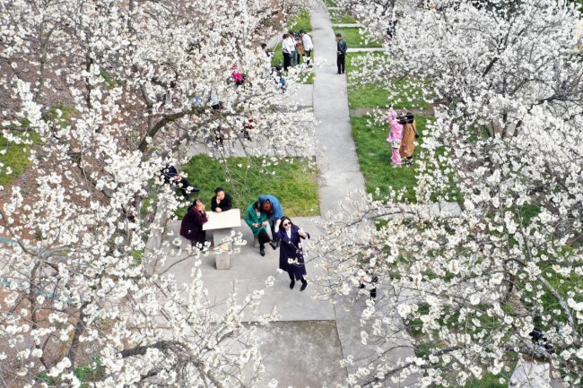 Tourists view cherry blossoms in Shahe town, Guangyuan, Southwest China's Sichuan province. [Photo/share.gyxww.cn]