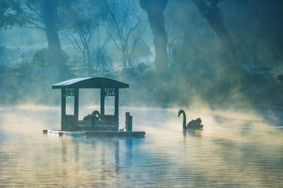 Black swans frolic on the lake at the Yangzhou Zoon in the spring morning light in Yangzhou, East China's Jiangsu province, March 2. [Photo by Xiang Jiafu/yznews.com.cn]