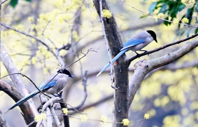 Grey magpies perch among the flowering cornel tree branches at the Zhuyuwan Scenic Spot in Yangzhou, East China's Jiangsu province, March 1. [Photo by Jiang Yongqing/yznews.com.cn]