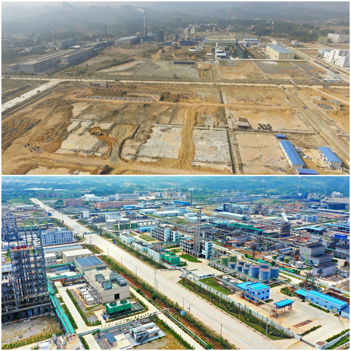 Top: An aerial photo taken on Dec 7, 2017, shows a chemical industrial park under construction in Huichang county, Jiangxi province. Bottom: An aerial photo taken on Oct 16, 2020, shows the same chemical industrial park after completion.