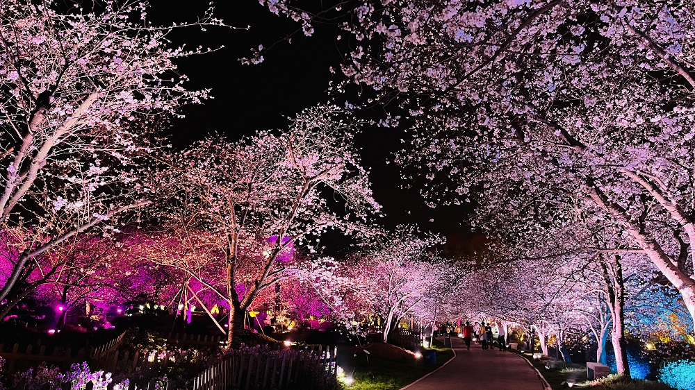 Flowers in bloom are such a delight at the Wuhan Cherry Blossom Garden at night. [Photo provided to www.chinaservicesinfo.com]