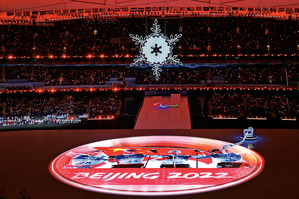 A giant glittering disc illuminated on the stage of the National Stadium during the closing ceremony of the Beijing 2022 Paralympics on Sunday.[Photo by Feng Yongbing/China Daily]