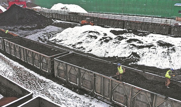 Railway workers shovel coal in Jiujiang, Jiangxi province. [Photo by Hu Guolin/For China Daily]