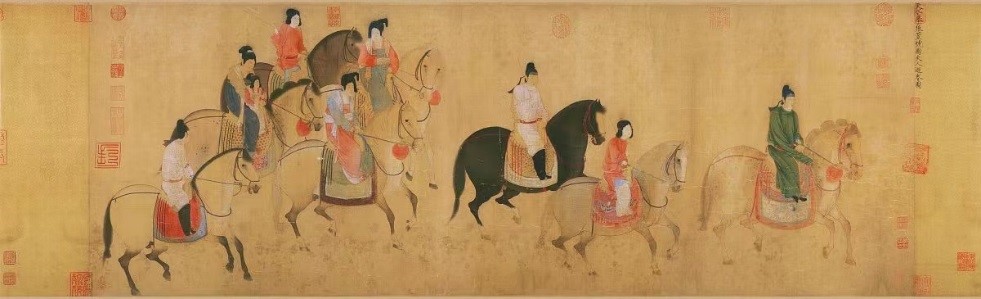 The painting features the sister of the legendary concubine Yang Yuhuan, Lady of Guoguo enjoy riding in spring with her family and servants. As the women in the Tang Dynasty had more freedom and were very independent, they wore men's clothes and enjoyed men's sports.