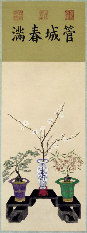 Emperor Tongzhi (1856-1875), who passed away at 19, painted three plants in a spring, including a jar of plum blossom and a potted landscape.
