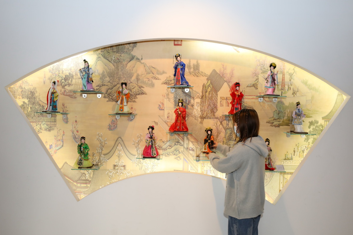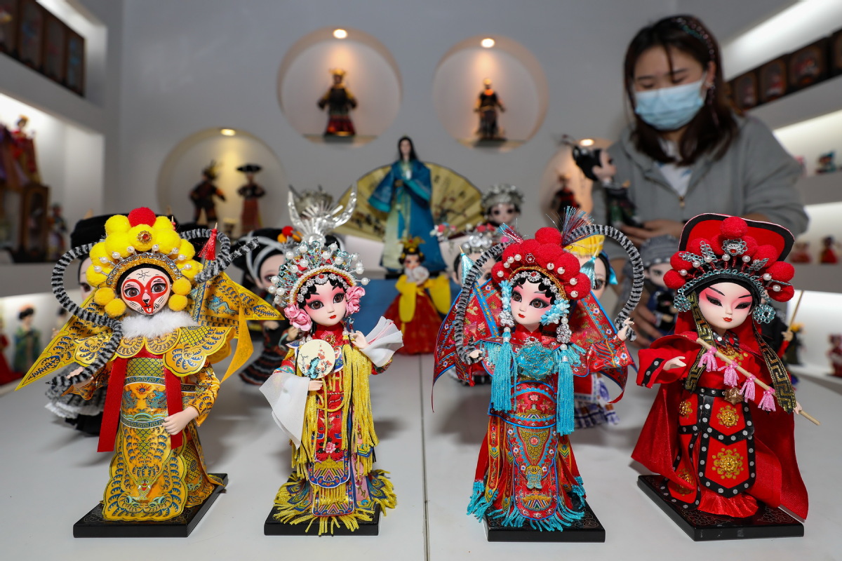 A woman takes photos of Tang dolls, the Beijing Winter Paralympics gift, in Huishui county, Qiannan Buyi and Miao autonomous prefecture, Southwest China's Guizhou province, on March 14, 2022. [Photo/IC]