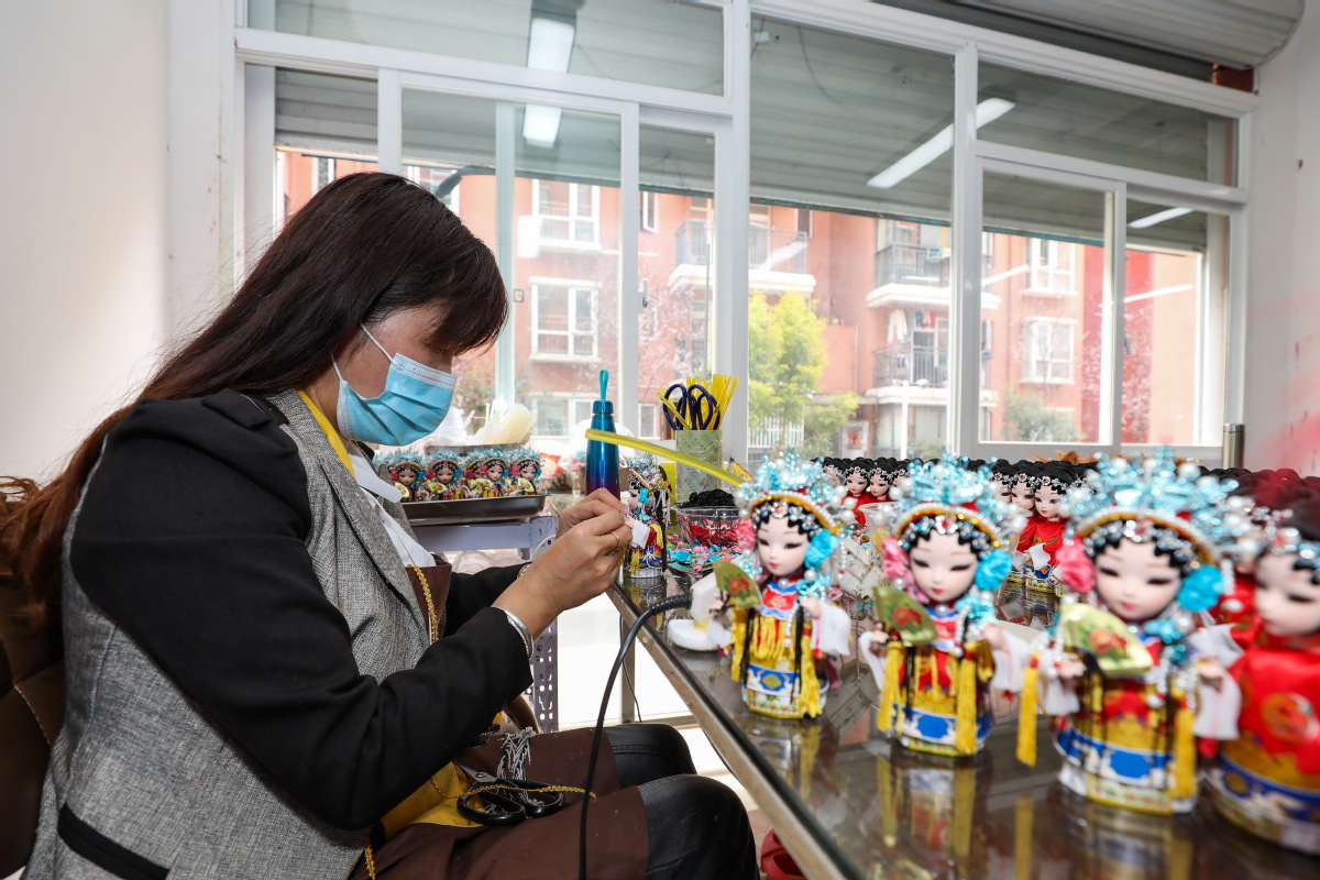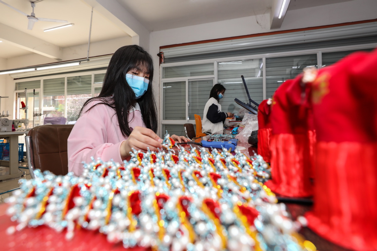 A woman makes accessories of Tang dolls, the Beijing Winter Paralympics gift, in Huishui county, Qiannan Buyi and Miao autonomous prefecture, Southwest China's Guizhou province, on March 14, 2022. [Photo/IC]