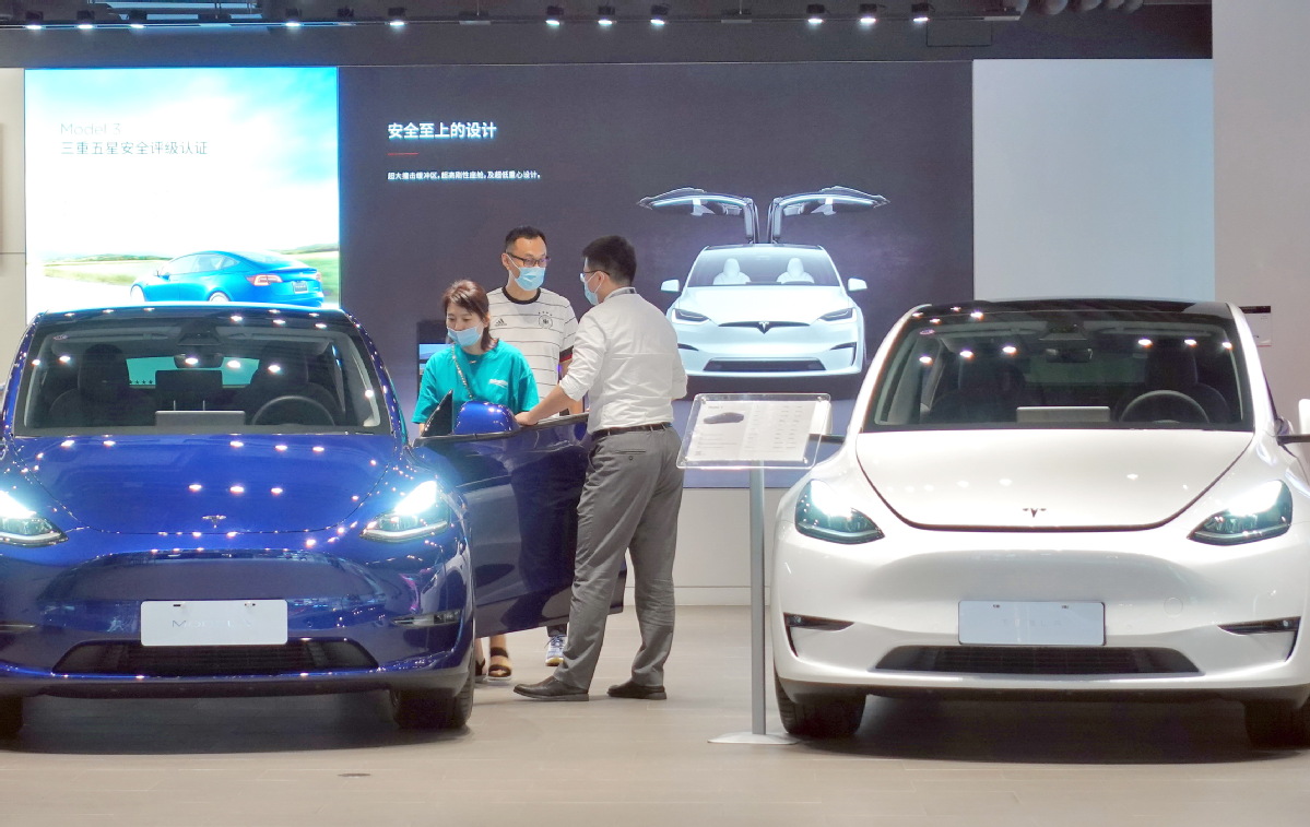 Potential buyers look at Tesla cars at a dealership in Beijing. [Photo by TANG KE/FOR CHINA DAILY]
