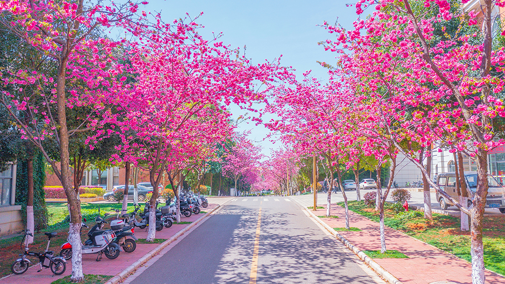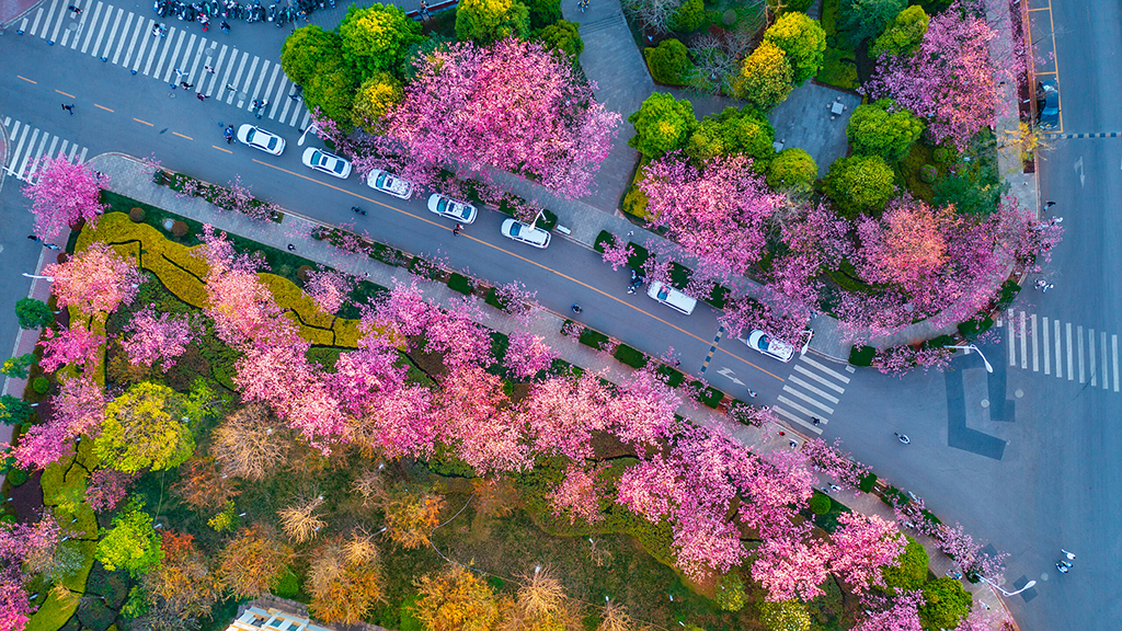 Clusters of cherry blossoms have bloomed in March in the Chenggong campus of Yunnan University – located in the city of Kunming, capital of Southwest China's Yunnan province.