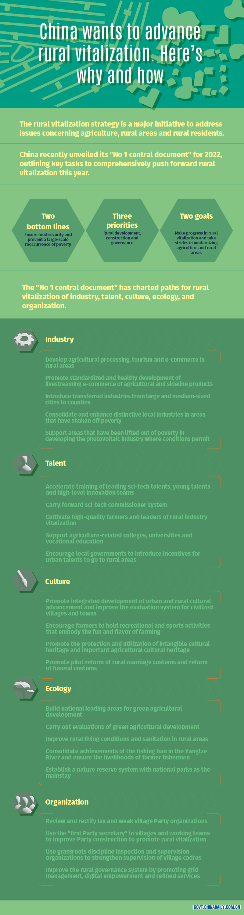 China recently unveiled its "No 1 central document" for 2022, outlining key tasks to comprehensively push forward rural vitalization this year.