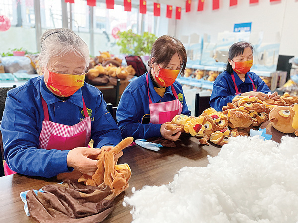 Supported by Chongli district's disabled persons' federation, Chen's workshop won the chance to produce plush toys of the new mascot. More than 40 local people with disabilities make up the workforce, and sew the outer fabrics, fill the toys with cotton and other stuffing materials, and then package them.