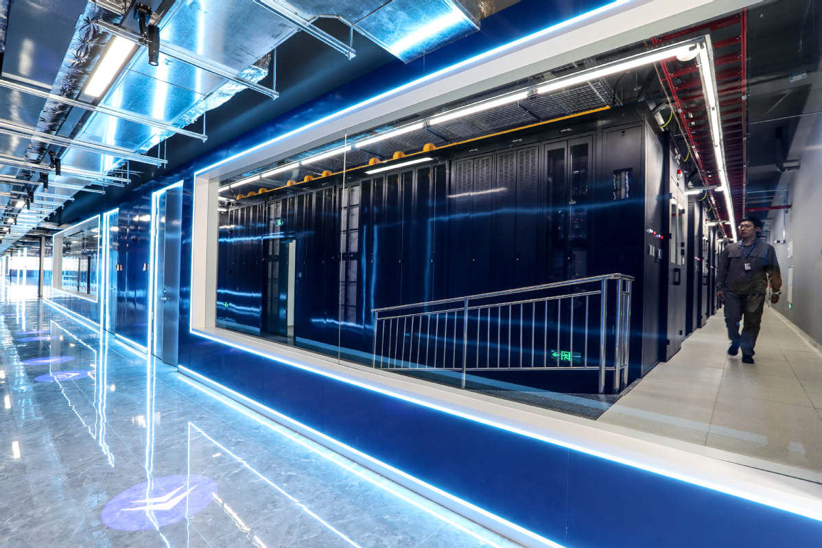 A China Mobile employee inspects cloud servers at a facility in Nanjing, Jiangsu province, on June 6, 2021. [Photo/Xinhua]