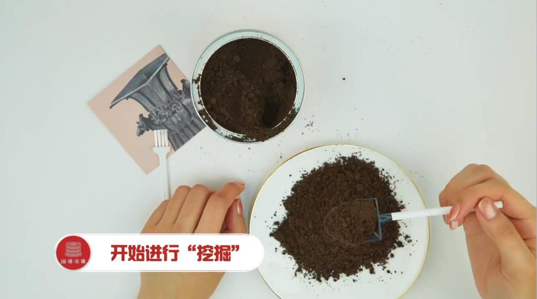 First step, use the little shovel to dig out the earth-like cookie pieces on the surface into a small bowl. [Photo/Official WeChat account of the National Museum of China]
