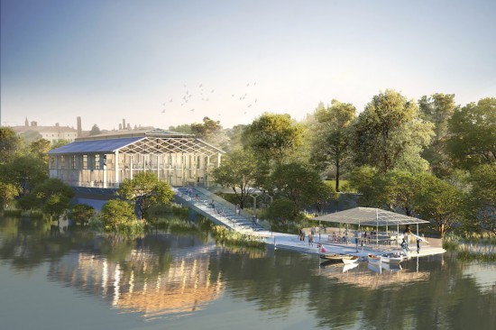 The Idroscalo, which was built on a river in the 1920s, has a unique architectural style and great historical and artistic value. Tang envisioned turning the existing ramp into a stairway that leads to an open terrace floating on the river.