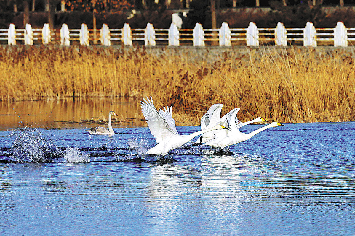 Swans take off from a river in Beijing's Miyun district in December. CHEN YANHUA/FOR CHINA DAILY