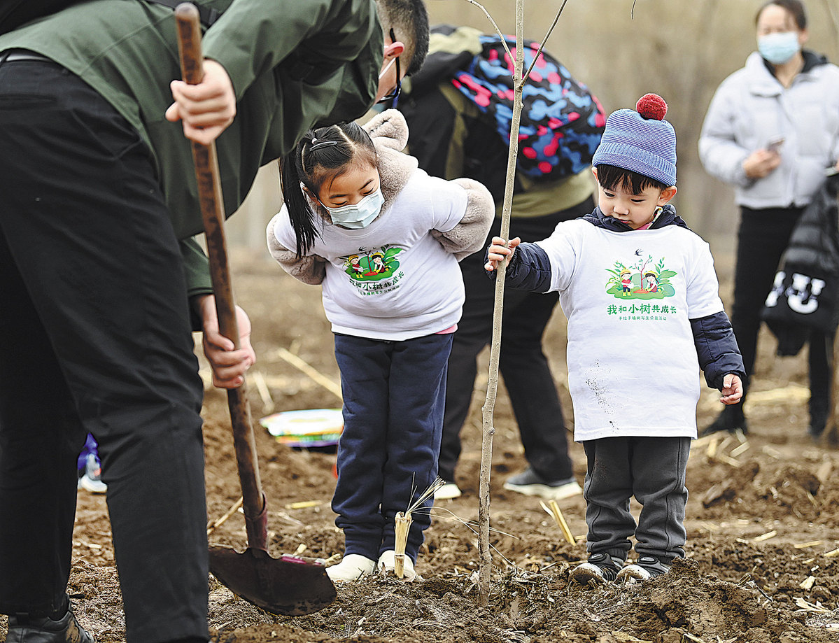 Children and their parents plant trees in Beijing on March 22. LI HE/XINHUA