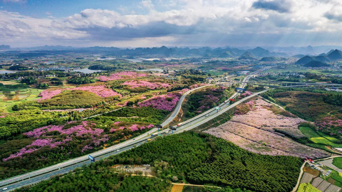 Vehicles drive through a sea of cheery blossoms on the G60 Shanghai-Kunming Expressway in Guizhou province. [Photo by Zheng Yuxiao/Provided to chinadaily.com.cn]