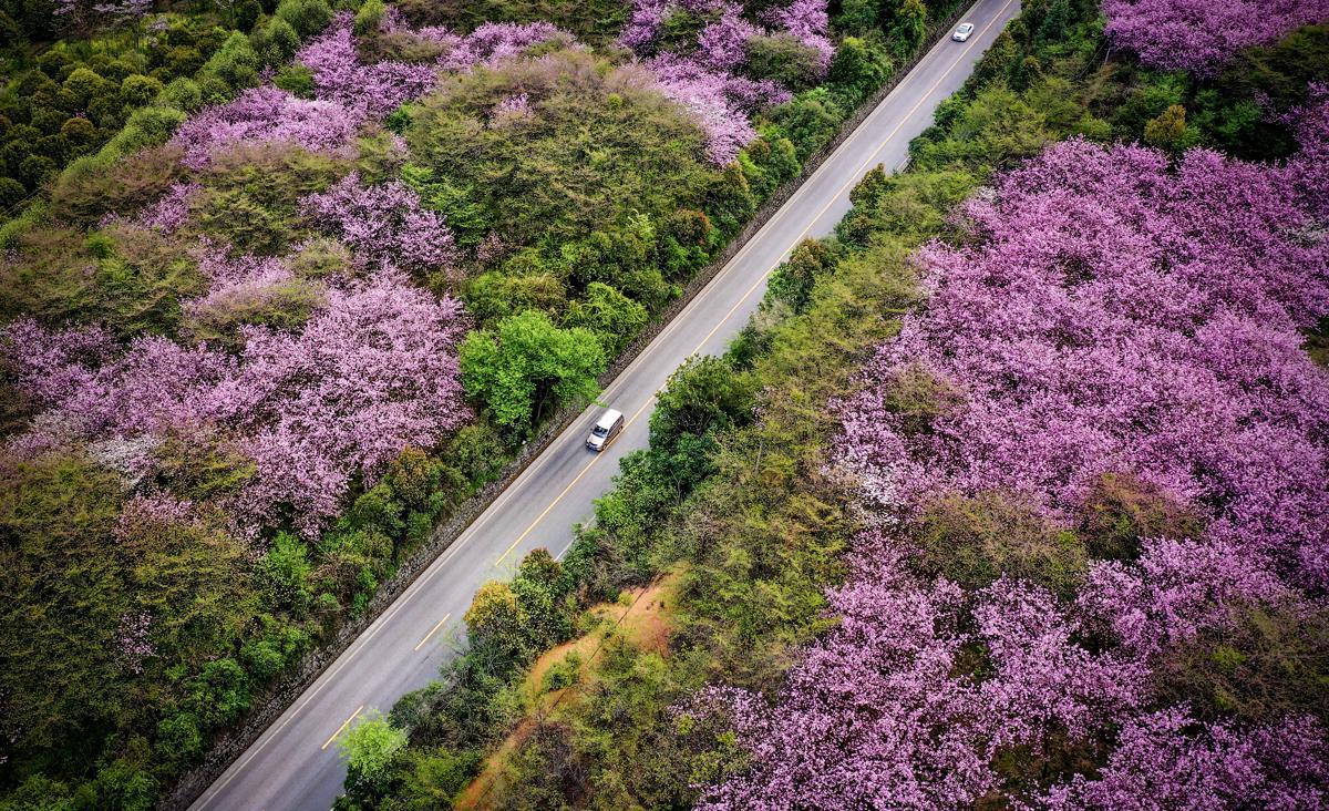 Vehicles drive through a sea of cheery blossoms on the G60 Shanghai-Kunming Expressway in Guizhou province. [Photo by Zheng Yuxiao/Provided to chinadaily.com.cn]