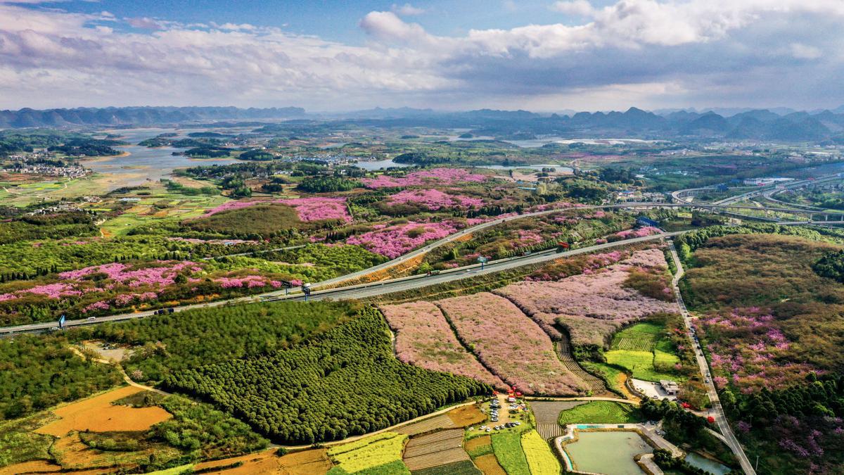 A section of the G60 Shanghai-Kunming Expressway in Guizhou province is surrounded by sea of cherry blossoms. [Photo by Zheng Yuxiao/Provided to chinadaily.com.cn]