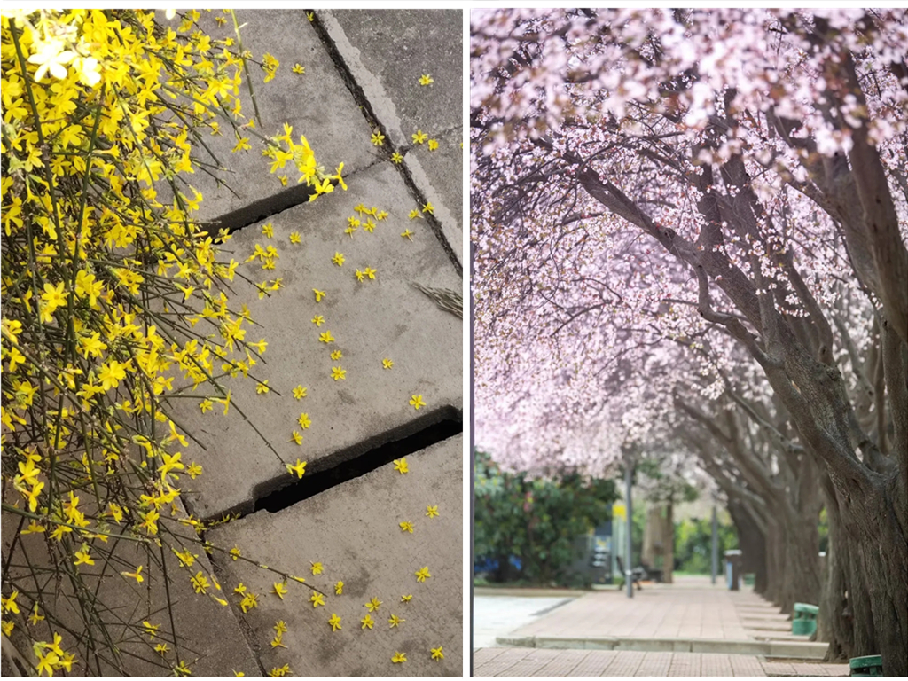 Yellow winter jasmines and pink peach blossoms in bloom at the Emperor Qinshihuang’s Mausoleum Site Museum [Photo/Official WeChat account of the Emperor Qinshihuang’s Mausoleum Site Museum]