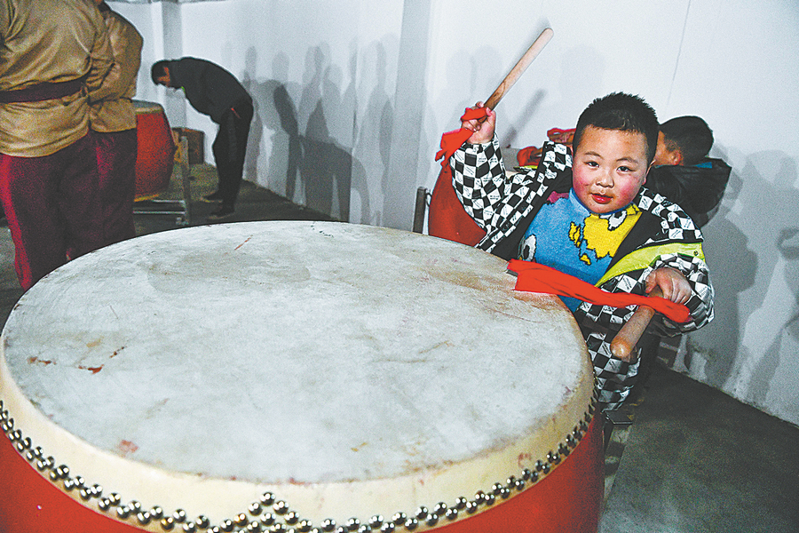A child plays with a drum in Longshan township. YANG WENBIN/FOR CHINA DAILY