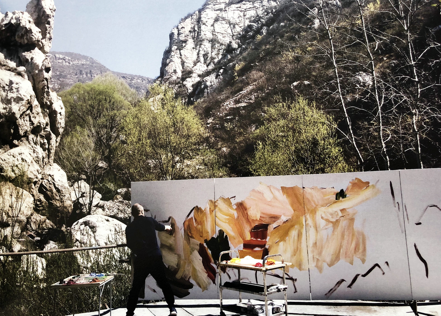 Yin Zhaoyang paints Songshan Mountain in his native Henan province. [Photo provided to China Daily]