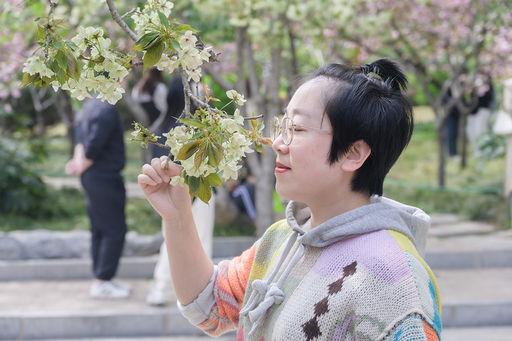A tourist smells the fragrance of Cerasusserrulata Grandiflora in Zhengzhou People’s Park in Central China’s Henan province. [Photo/IC]