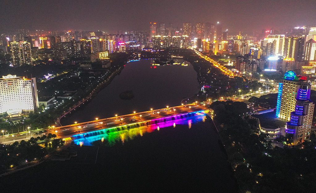 Aerial night views of a neon waterfall calling attention to the serene Nahu Lake and surrounding high-rise buildings in Nanning, South China’s Guangxi Zhuang autonomous region [Photos/IC]