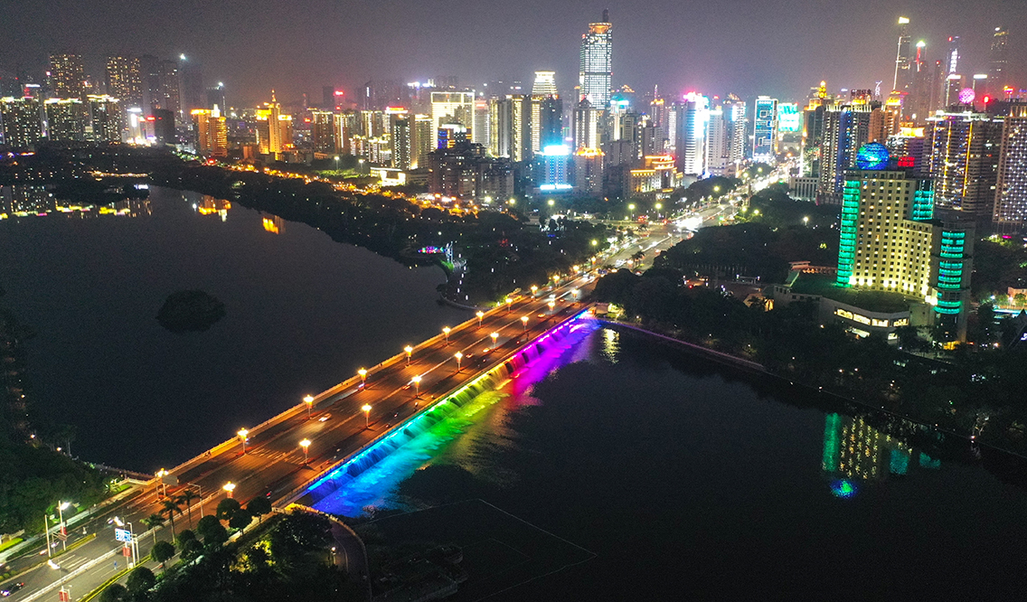 Neon waterfall brightens nighttime at Nanning