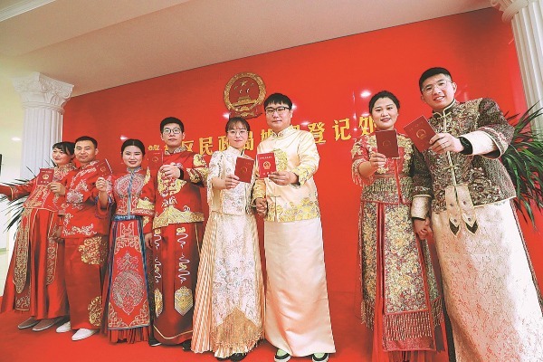 Brides and grooms across China rushed to tie the knot on Tuesday, Feb 22, 2022, a date with many "twos", to take advantage of the number's pronunciation, which sounds like "love" in Chinese, as well as a Chinese belief that good things come in pairs.