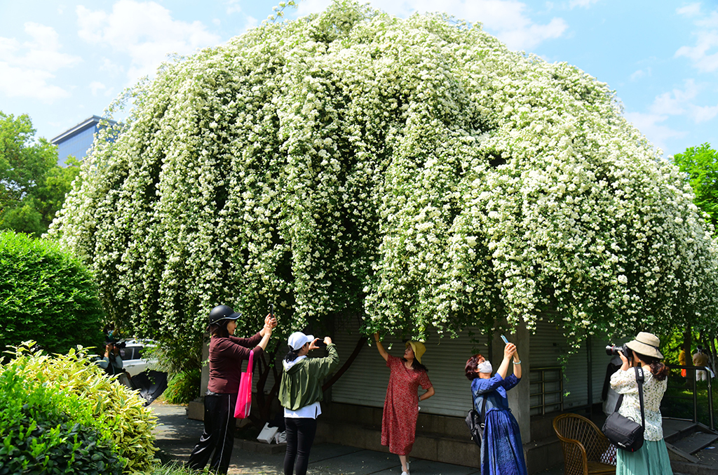 Can you guess the name of the flowers in the pictures? They are called Aquilaria sinensis. In Hangzhou, Zhejiang province, they bloom around springtime exuding pleasant scents. They grow in dense rows and look like bushy hair. Some say they are reminded of a waterfall from a distance.