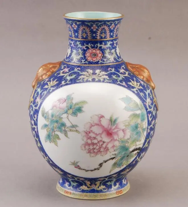 Famille-rose double-ring vase with interlocking flowers on blue ground and peonies on the reserved panels, Republic of China [Photo/Official WeChat account of the Guangdong Folk Craft Museum]