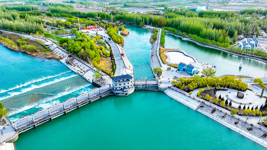 An aerial view of the Kaidu River scenic area in Bohu county, Northwest China’s Xinjiang Uygur autonomous region is surrounded by green trees. [Photo/IC]